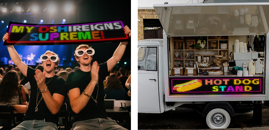 Suitable for various scenarios such as vehicle displays, advertisements,shop windows, stage performances, store signs, clothing and bags, festival events, atmosphere creation, e-sports, food trucks, indoor and outdoor decorations, etc.