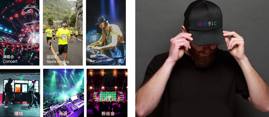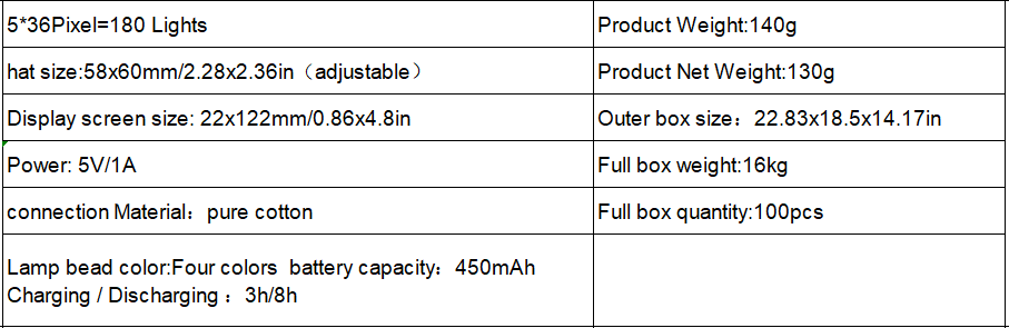 This product is a product independently developed and produced by Shenzhen Good Color Yang Technology Co., LTD. -LED display hat. High quality cotton +FPCB. Use APP operation support text DIY graffiti animation picture light effect clock and other functions. Battery powered, long life, easy to use. Size and weight meet cross-border logistics standards, greatly saving transportation and distribution costs. Perfect for parties, festivals, outdoor camping, night runs, etc.