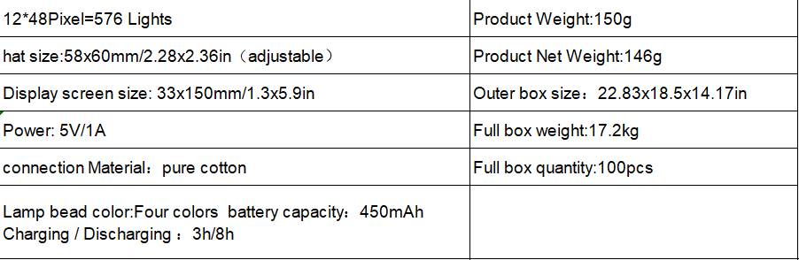 This product is a product independently developed and produced by Shenzhen Good Color Yang Technology Co., LTD. -LED display hat. High quality cotton +FPCB. Use APP operation support text DIY graffiti animation picture light effect clock and other functions. Battery powered, long life, easy to use. Size and weight meet cross-border logistics standards, greatly saving transportation and distribution costs. Perfect for parties, festivals, outdoor camping, night runs, etc.