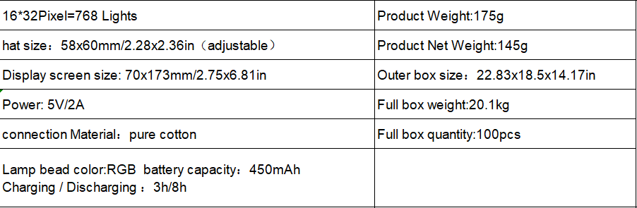 This product is a product independently developed and produced by Shenzhen Good Color Yang Technology Co., LTD. -LED display hat. High quality cotton +FPCB. Use APP operation support text DIY graffiti animation picture light effect clock and other functions. Battery powered, long life, easy to use. Size and weight meet cross-border logistics standards, greatly saving transportation and distribution costs. Perfect for parties, festivals, outdoor camping, night runs, etc.