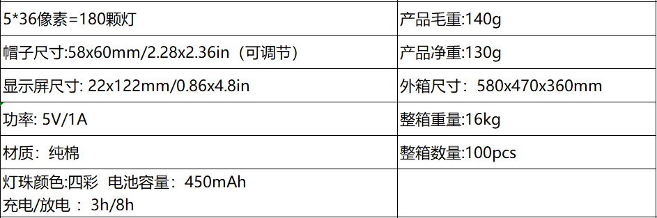 本产品是深圳市好彩阳科技有限公司自主研发生产的一款产品-LED 显示屏帽子。采用高质量纯棉+FPCB。使用APP操作 支持文字 DIY 涂鸦 动画 图片 灯效 时钟等功能。电池供电,续航时间长,使用方便。尺寸和重量满足跨境物流标准,大大节约了运输和配送成本。非常适合聚会派对 节日活动 户外露营 夜跑 等场所。